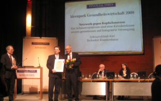 Schmerzklinik gewinnt Ideenwettbewerb Kiel, 24. März 2009. Die Schmerzklinik Kiel und die Techniker Krankenkasse (TK) sind gestern (23. März) in Berlin gemeinsam beim Wettbewerb „Ideenpark Gesundwirtschaft 2009“ ausgezeichnet worden. Das Kieler Versorgungsmodell zur Behandlung von chronischen Kopfschmerzen gehört zu den zehn preisgekrönten Gesundheitsangeboten in Deutschland. Die Financial Times Deutschland ...