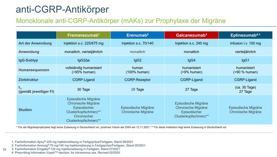 Am 11. November 2021 gab der Ausschuss für Humanarzneimittel (CHMP) der Europäische Arzneimittelbehörde (EMA) in Amsterdam ein positives Gutachten ab, in dem er die Erteilung einer Genehmigung für das Inverkehrbringen des Arzneimittels Vyepti zur Migräneprophylaxe empfahl. Der Antragsteller für dieses Arzneimittel ist H. Lundbeck A/S. Vyepti wird als 100-mg-Konzentrat zur Herstellung einer Infusionslösung erhältlich sein. Der Wirkstoff von Vyepti ist Eptinezumab, ein humanisierter monoklonaler Antikörper, ein Migräneprophylaktikum (ATC-Code: N02CD05), das durch die Verhinderung der Aktivierung der CGRP-Rezeptoren wirkt.