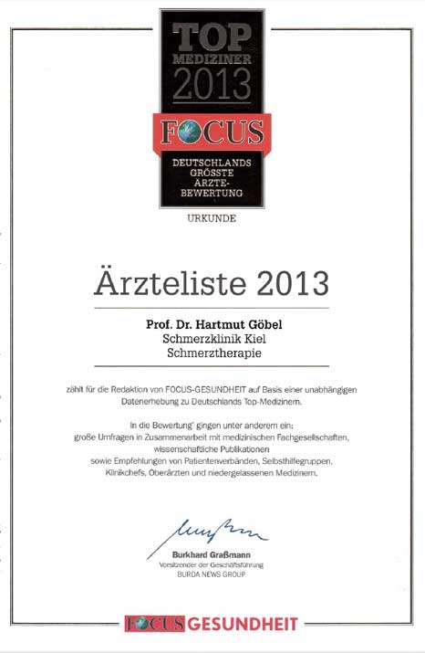 Prof. Dr. med. Hartmut Göbel, Chefarzt der Schmerzklinik Kiel, zählt für die Redaktion von Fokus Gesundheit auf Basis einer unabhängigen Bewertung zu Deutschlands Topmedizinern im Bereich der Schmerztherapie. Der Spezialist für neurologische und verhaltensmedizinische Schmerztherapie mit Schwerpunkt Migräne, Kopfschmerzen, Clusterkopfschmerzen, Kopfschmerz bei Medikamentenübergebrauch, Neuralgien und Nerven- und Muskelschmerzen an der Schmerzklinik Kiel ist erneut in die renommierte Ärzteliste 2013 aufgenommen worden.
