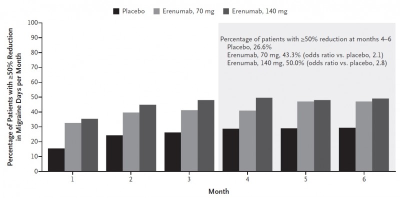 In der gleichen Ausgabe des New England Journal of Medicine am 29.11.2017 werden auch neue Daten zu Erenumab in der Vorbeugung der episodischen Migräne publiziert. Dabei wurde Erenumab subcutan im Abstand von 4 Wochen in einer Dosierung von 70 mg oder 41 mg verabreicht. Die Analyse zeigte, dass der Antikörper signifikant die Migränehäufigkeit, den Effekt der Migräne auf die täglichen Aktivitäten sowie die Notwendigkeit für die Anwendung von Migräneakutmedikamenten im Zeitraum von 6 Monaten reduziert.