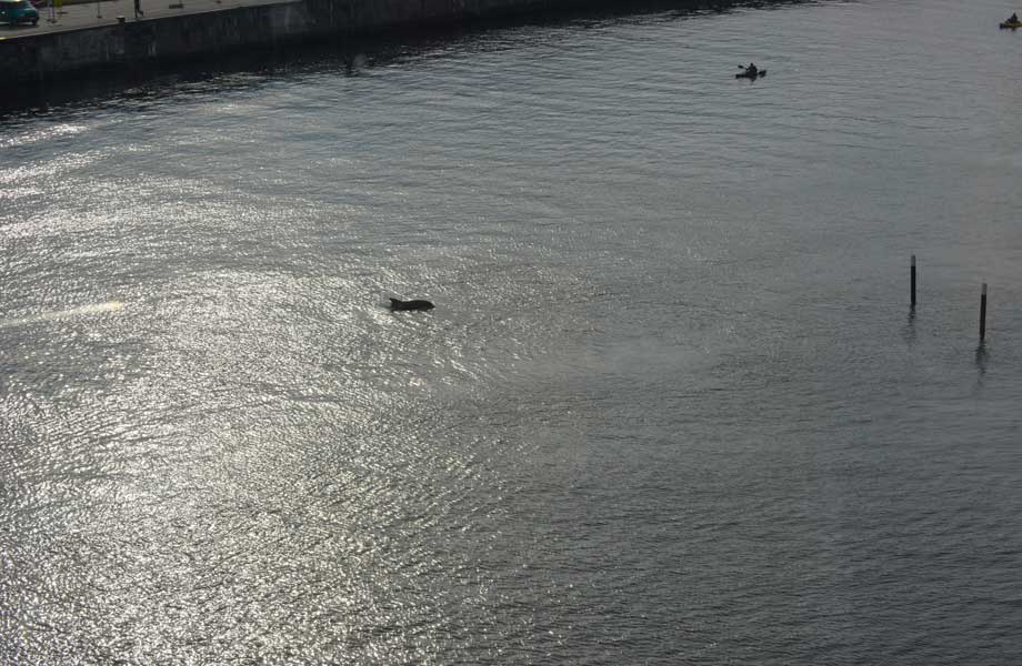 Unser Kieler Flipper hält sich seit mehreren Tagen nun regelmäßig vor der Schmerzklinik Kiel in der Schwentine auf und begeistert Patientinnen und Patienten sowie das Klinikteam. Er begleitet sehr gerne die Schwentinefähre und nimmt Kontakt mit Paddlern und Schaulustigen auf. Ein paar Fotos von heute Abend 16 Uhr vom Treppenhaus der Schmerzklinik.