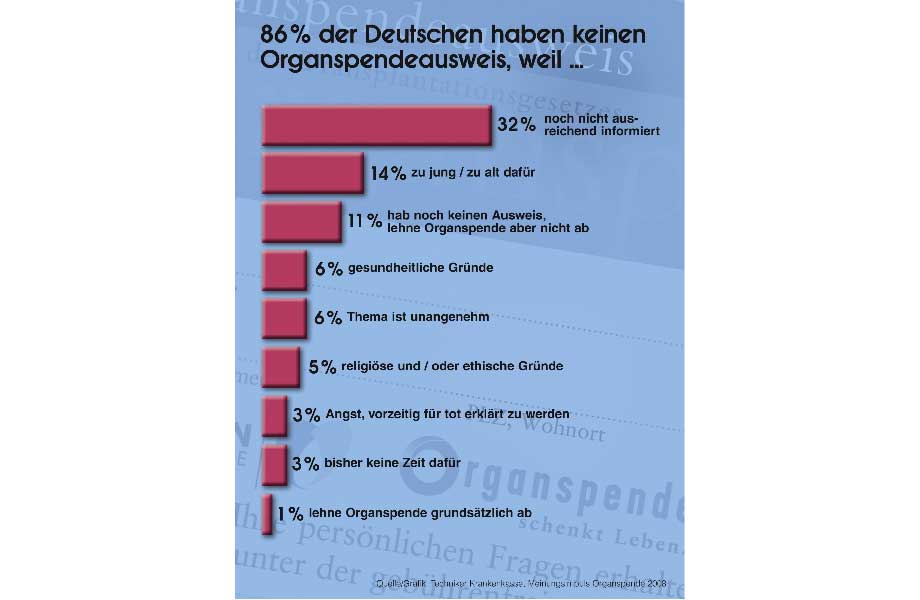 12.000 Menschen in Deutschland stehen derzeit auf der Warteliste für ein Spenderorgan. An jedem Tag sterben drei von ihnen, weil sie das lebensrettende Organ nicht rechtzeitig erhalten. Wie die Forsa-Umfrage zeigt, gehen die Antworten der Befragten, warum sie keinen Organspendeausweis ausfüllen, meist auf mangelnde Information, Missverständnisse und Vorurteile zurück.