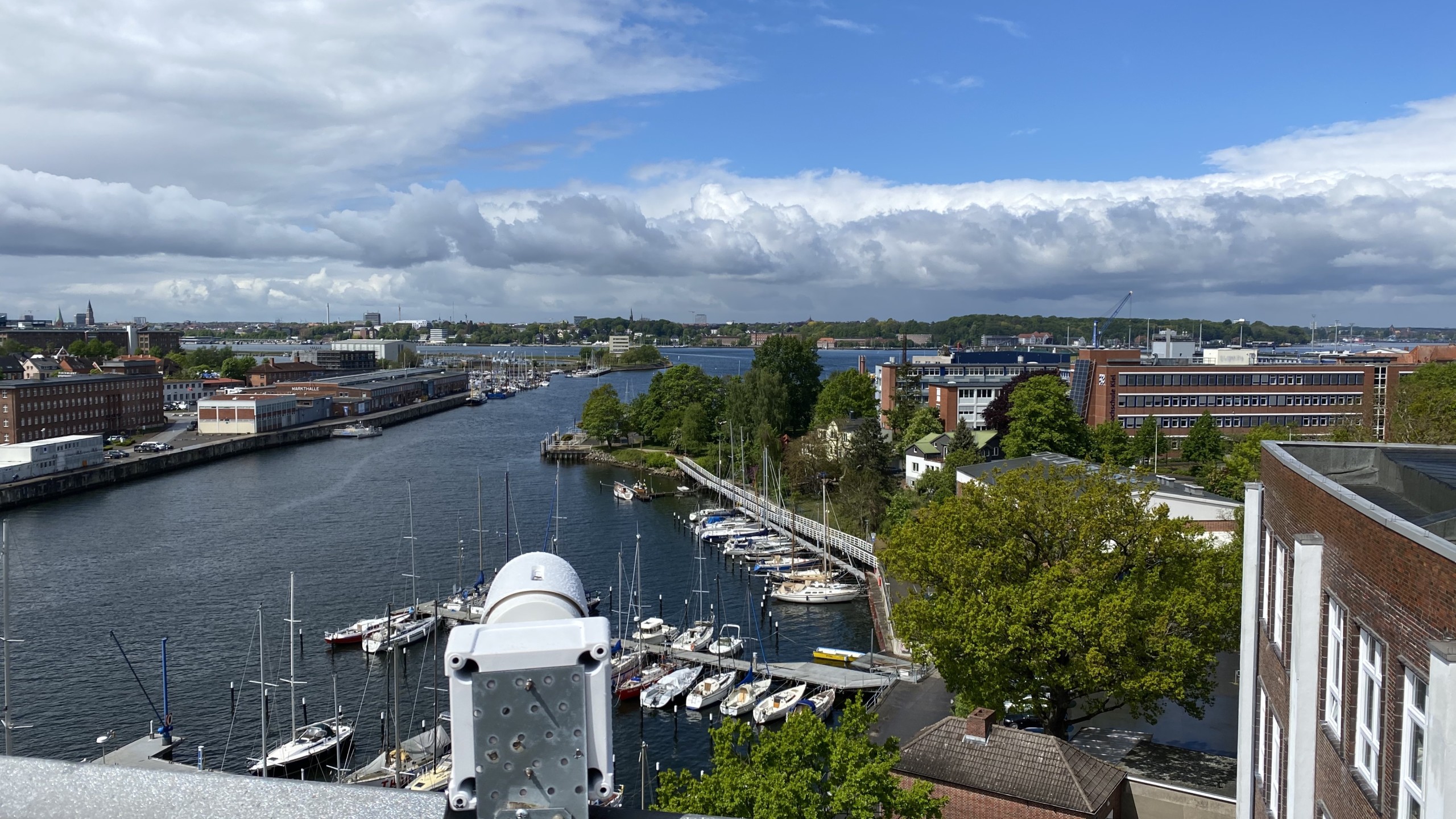 Auf dem Bild links sehen Sie die Webcam auf dem Dach der Schmerzklinik Kiel.